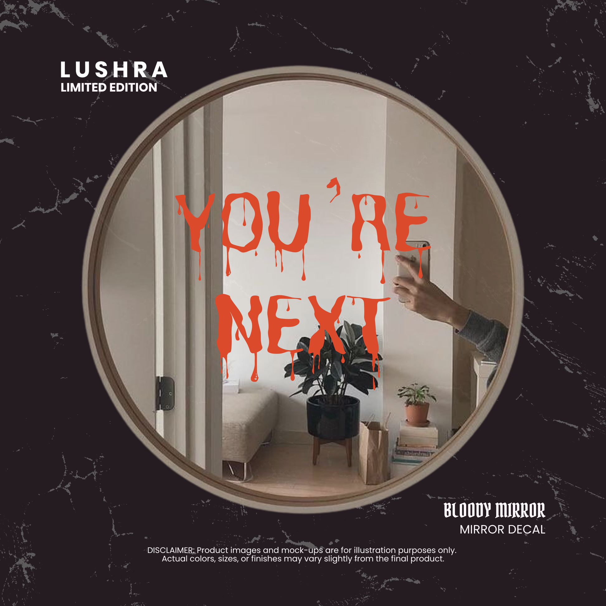 Our bloody mirror writing decals are made from premium, durable vinyl in a striking red finish that mimics eerie, blood-dripped text. Each decal measures 16” wide, with height depending on your custom design. Precut for easy application, it comes in one ready-to-use piece—perfect for smooth surfaces like mirrors, acrylic, wood, or painted walls. A chilling touch to any Halloween setup!