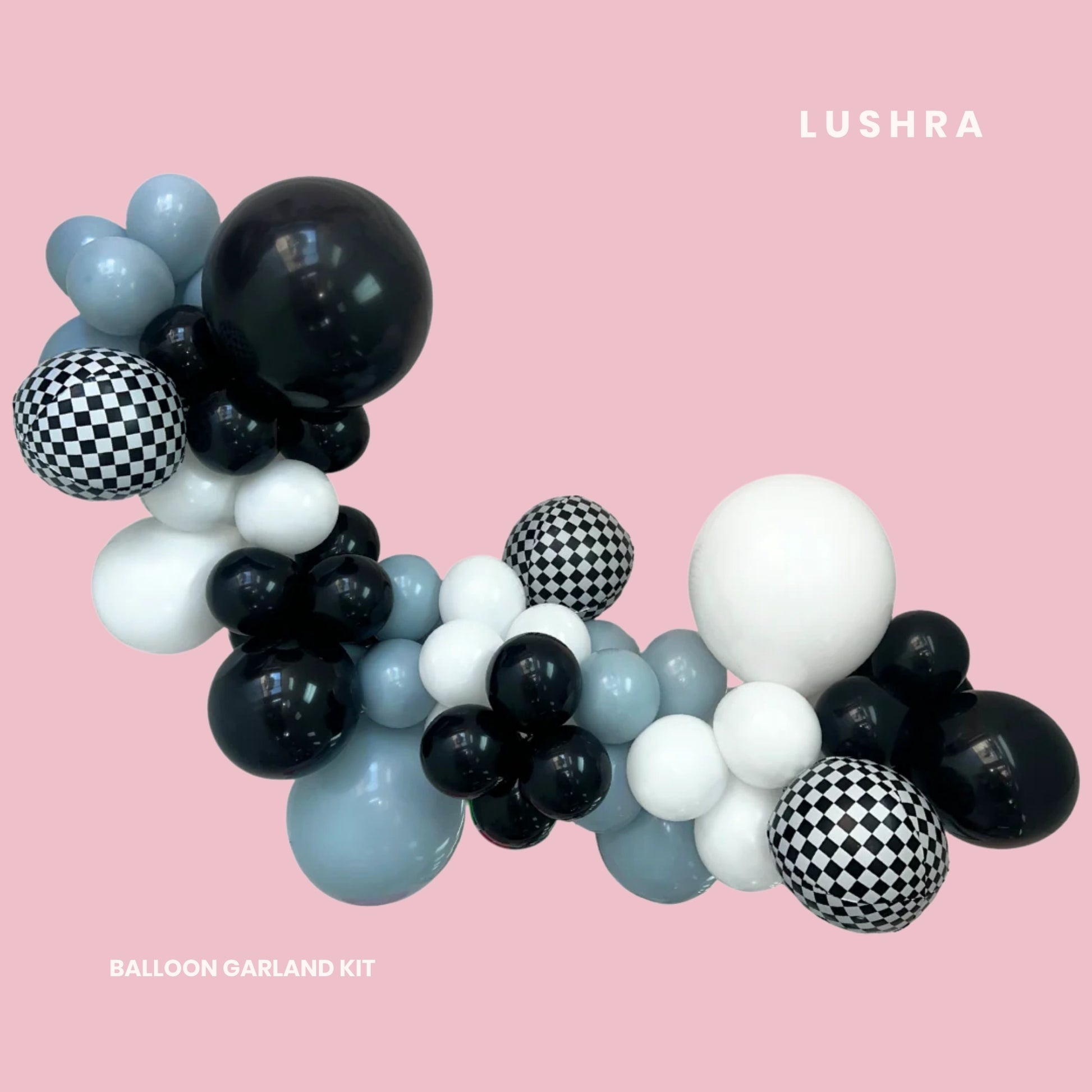 Also includes checkered mylar balloons.